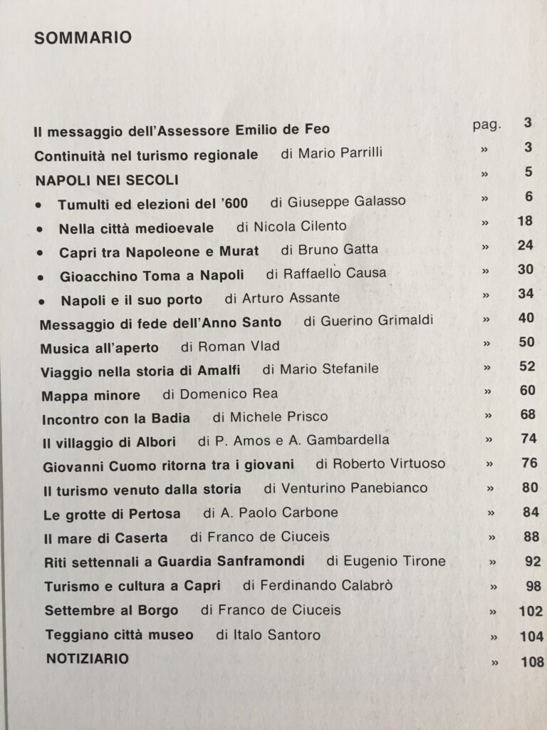 Il primo numero apparve nel dicembre del 1974. In copertina la foto, firmata da Mimmo Jodice, di un particolare del presepe della Reggia di Caserta. Si capì subito che si trattava della più prestigiosa tra le pubblicazioni turistiche, non solo della Campania. Era il tempo in cui alla guida del settore vi era Roberto Virtuoso, assessore, ma – in linea più generale – vera guida politica di una Regione che proprio nel turismo si apprestava a indicare per tutto il territorio un modello di sviluppo moderno ed efficiente, basato certo sulle straordinarie risorse ambientali e paesaggistiche, ma sostenuto da un progetto culturale di ampio respiro. La Rivista rispondeva proprio a questo obiettivo. E a scorrere i nomi dei collaboratori chiamati a raccolta, l’iniziativa editoriale di <Civiltà della Campania>, bimestrale promosso dall’Assessorato regionale in collaborazione con gli enti provinciali dei cinque capoluoghi, si propose subito come una vera e propria antologia delle eccellenze campane nei diversi campi.