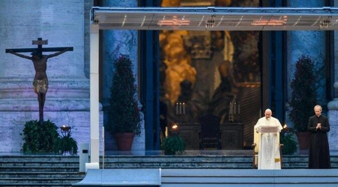 Ma un Papa non muore mai sulla piazza, come quella sera, una settimana prima di Pasqua, diventata “focolare domestico” per i cristiani e, spogliata della maestosità dei tempi ordinari, piccolo cortile di rappresentanza di un affetto senza confini. Mai però aveva conosciuto il silenzio della solitudine, del deserto di folla intorno al colonnato del Bernini che invece l’abbraccia. E mai s’erano visti i passi lenti e assorti di un Papa che saliva all’altare, da una rampa che, per i riflessi dei colori della pioggia, sembrava il pavimento di una piccola fetta del cielo. Solo, sovrastato da spazi dilatati e irriconoscibili, Francesco andava incontro al passaggio più drammatico e solenne del suo pontificato. Proprio da quella piazza vuota l’umanità aspettava conforto e, arrivato sul sagrato, con ai lati il Crocifisso che aveva preso e portato con sé dal pellegrinaggio, a piedi, nella Roma deserta, e l’icona della Salus populi romani, il Papa ha esposto tutta la forza della “mano alzata” della Chiesa che respinge il male: un tempo le grandi epidemie e il flagello della peste, oggi l’attacco, non meno insidioso di un virus del tempo della globalizzazione.
