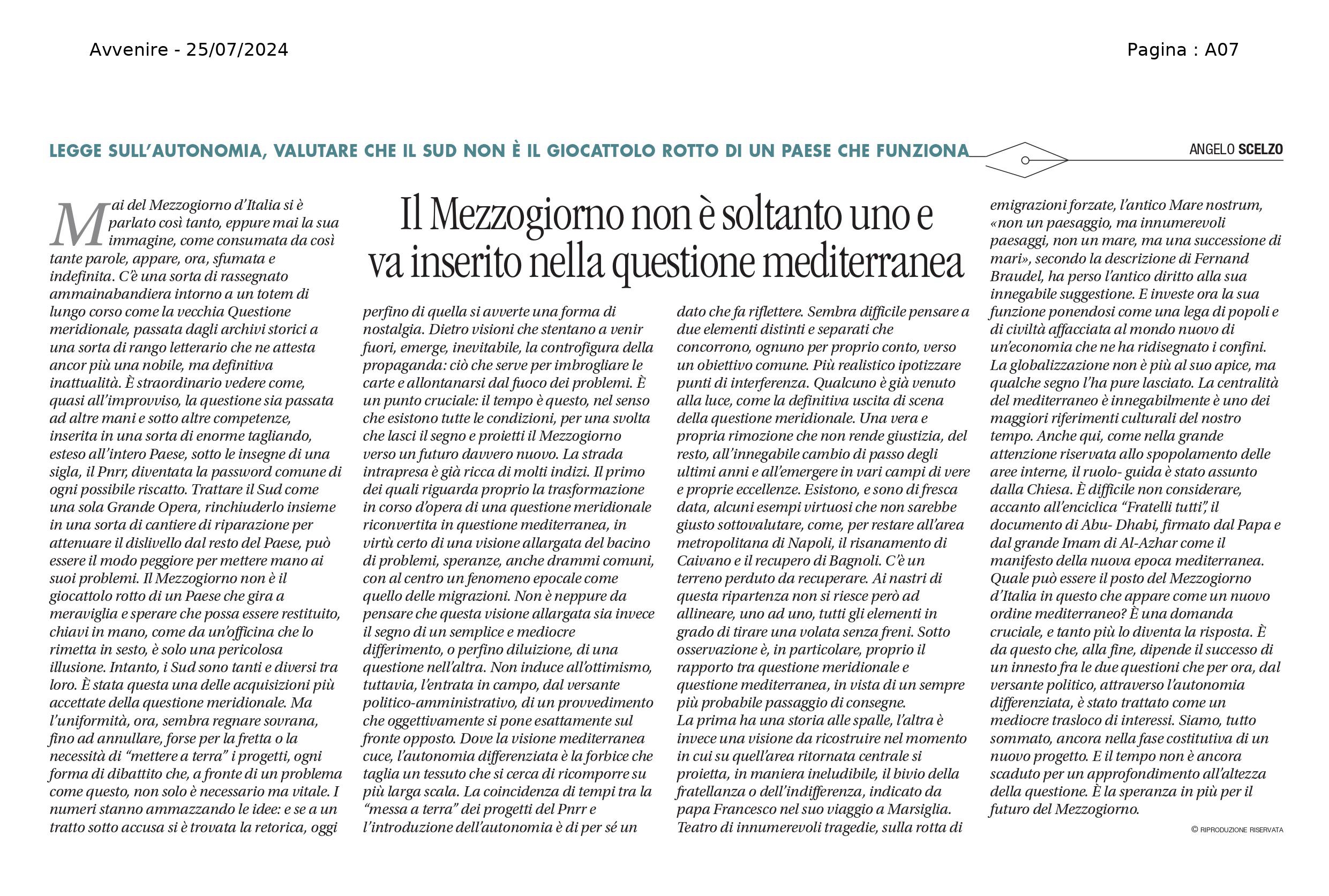 Il Mezzogiorno non è soltanto uno e va inserito nella questione mediterranea
