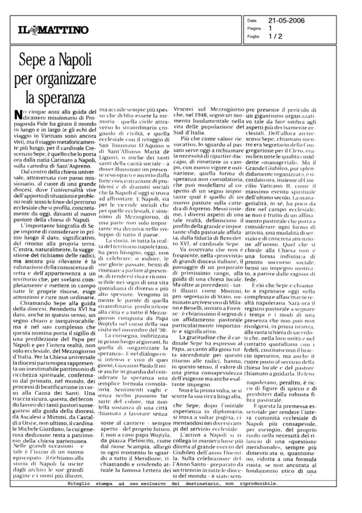 Sepe a napoli per organizzare la speranza