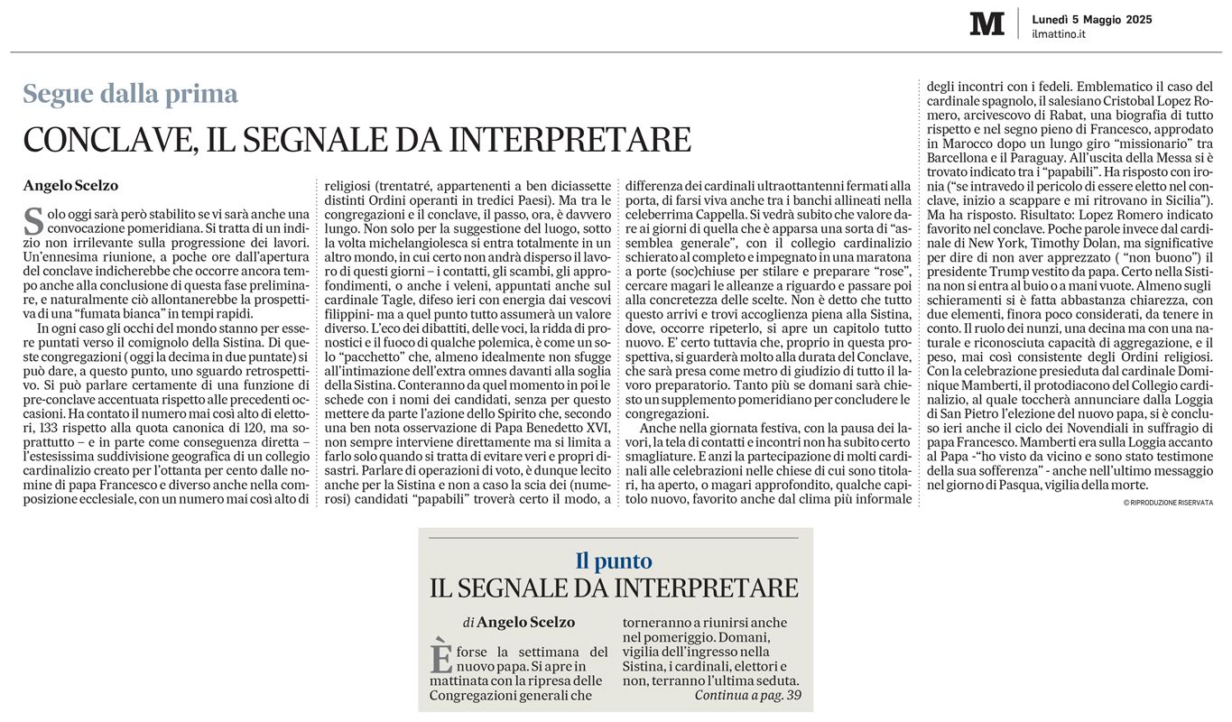 Scritto da Angelo Scelzo il . Pubblicato in Il Mattino. Nessun commento su Conclave, il segnale da interpretare